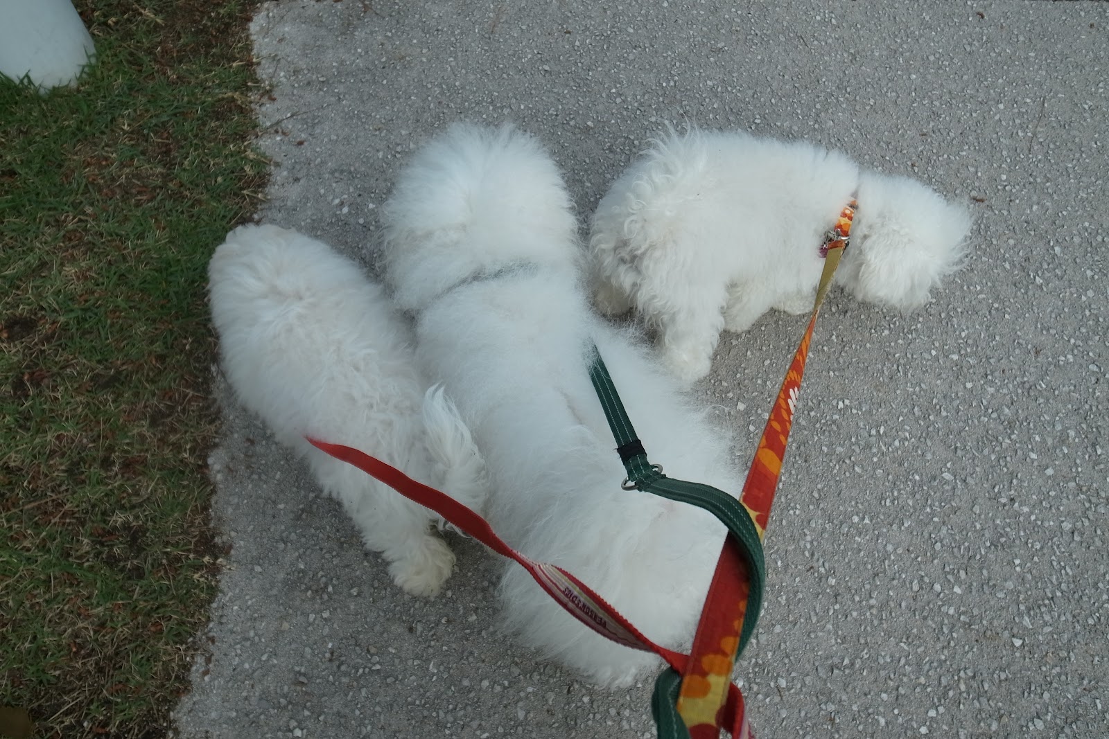 昨日のボロミニ集会から一夜明けて、本日、朝の散歩は3頭立ての飼主。