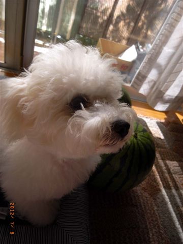 スイカに埋もれて 金沢方面、本日、梅雨の中休み。 ピナ・プリの下痢はぴたっと止まった。 お騒がせしました。ただ、ツーワンズ、ともに本日まだ運CHIが無いんだよな。出してみるまでホントのところはわかりません。 と云うことで、今朝は青空の下、ボス殿、お一人様のフルコースのお散歩。 ラッキー!! ところで、先刻、海の向こうのもんじろうから近況が届く。 どうやらスイカ三昧の日々らしい。 既に4kgオーバーということ 大きく育て!!