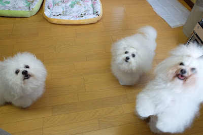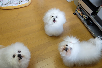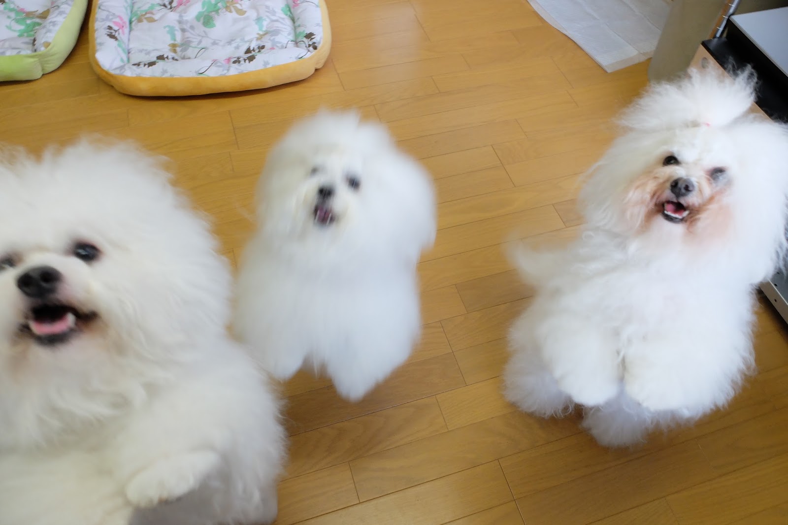 おやつをぶら下げると、待った無しのスリーボロズ。