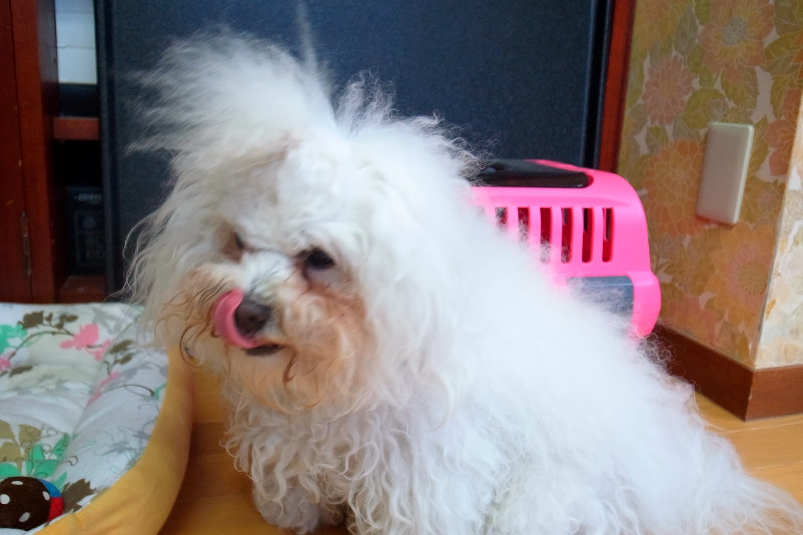 夕飯はしっかりと食べたボス殿、うしろでは食後すぐに取っ組合いをはじめるピナプリ