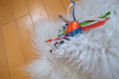 取っ組合いに飽きると、ひっくり返ってオモチャでひとり遊びのピナ姫